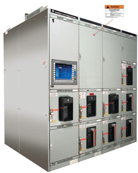 For a typical 4 section or less switch gear lineup, only one label (worst case) on the front side is necessary. For longer sections additional labels can be applied every 5-10 feet. Since both front and back-side switch gear covers are hinged, the back-side covers should also be labeled.